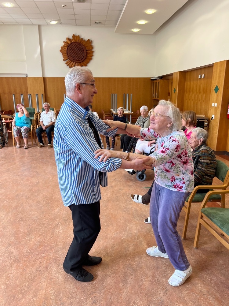Vřelé přivítání s klienty a první tóny vídeňského valčíku zahájily dnešní dopoledne v Domově Slunečnice, kde své taneční a terapeutické hodiny vedl taneční mistr, pedagog, choreograf MgA. Petr Veleta Ph.D.