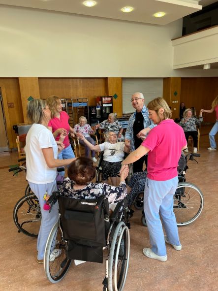 Pod jeho laskavým vedením se klienti postupně zapojili do jemných tanečních prvků, které byly přizpůsobeny jejich možnostem a potřebám. Petr Veleta citlivě propojil prvky tance a terapie tak, aby každý zúčastněný pocítil radost z pohybu a vnitřní harmonii. Do společného rytmu se s nadšením zapojili i klienti používající chodítka a vozíky. S klienty citlivě tančil, držel je za ruce a vedl jednoduché pohyby do rytmu hudby a společně vytvářeli krásné tance plné emocí a propojení. Hudba provázela nejen jednoduché kroky a taneční gesta ale především úsměvy a radost ze společného prožitku.