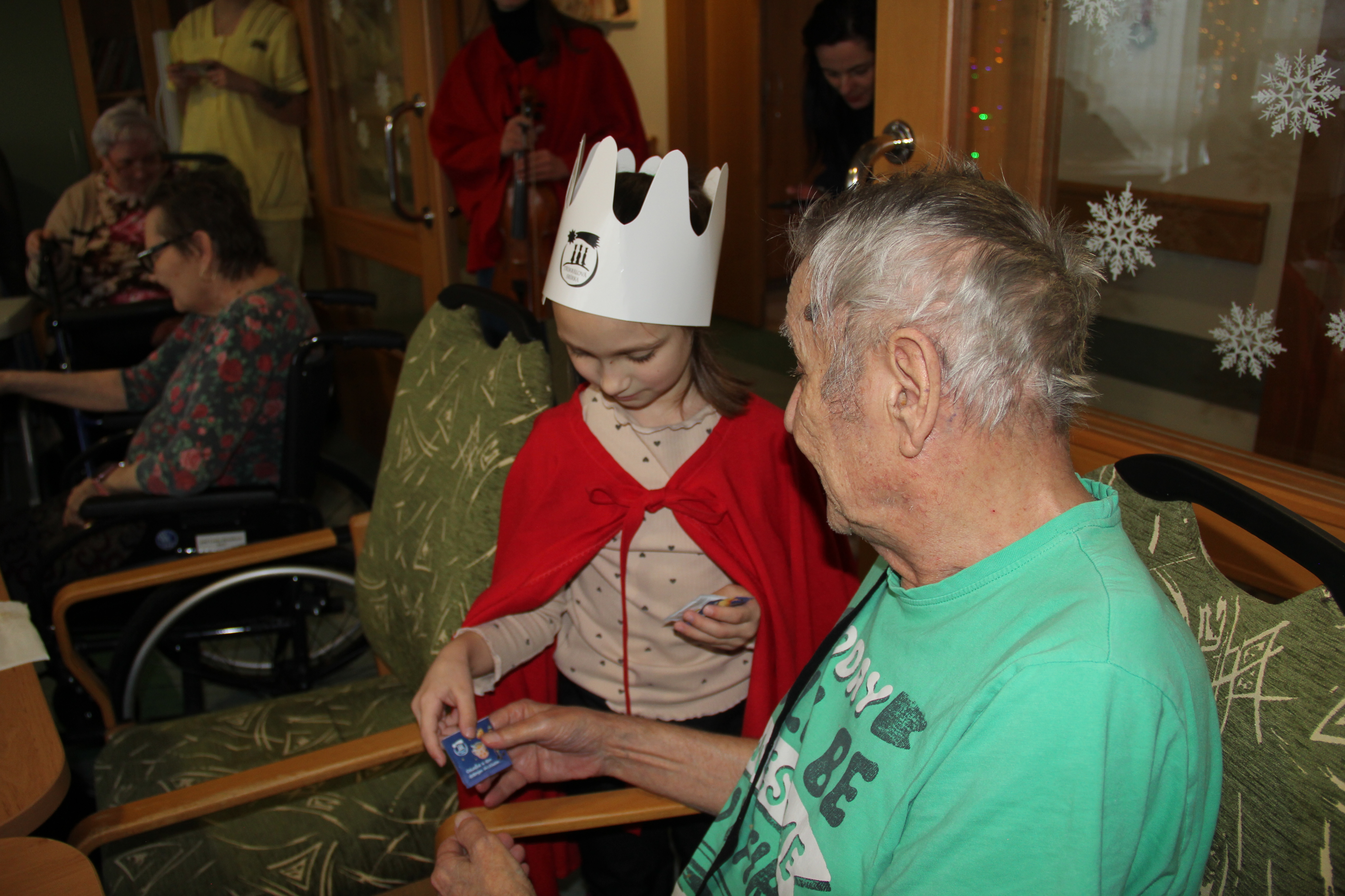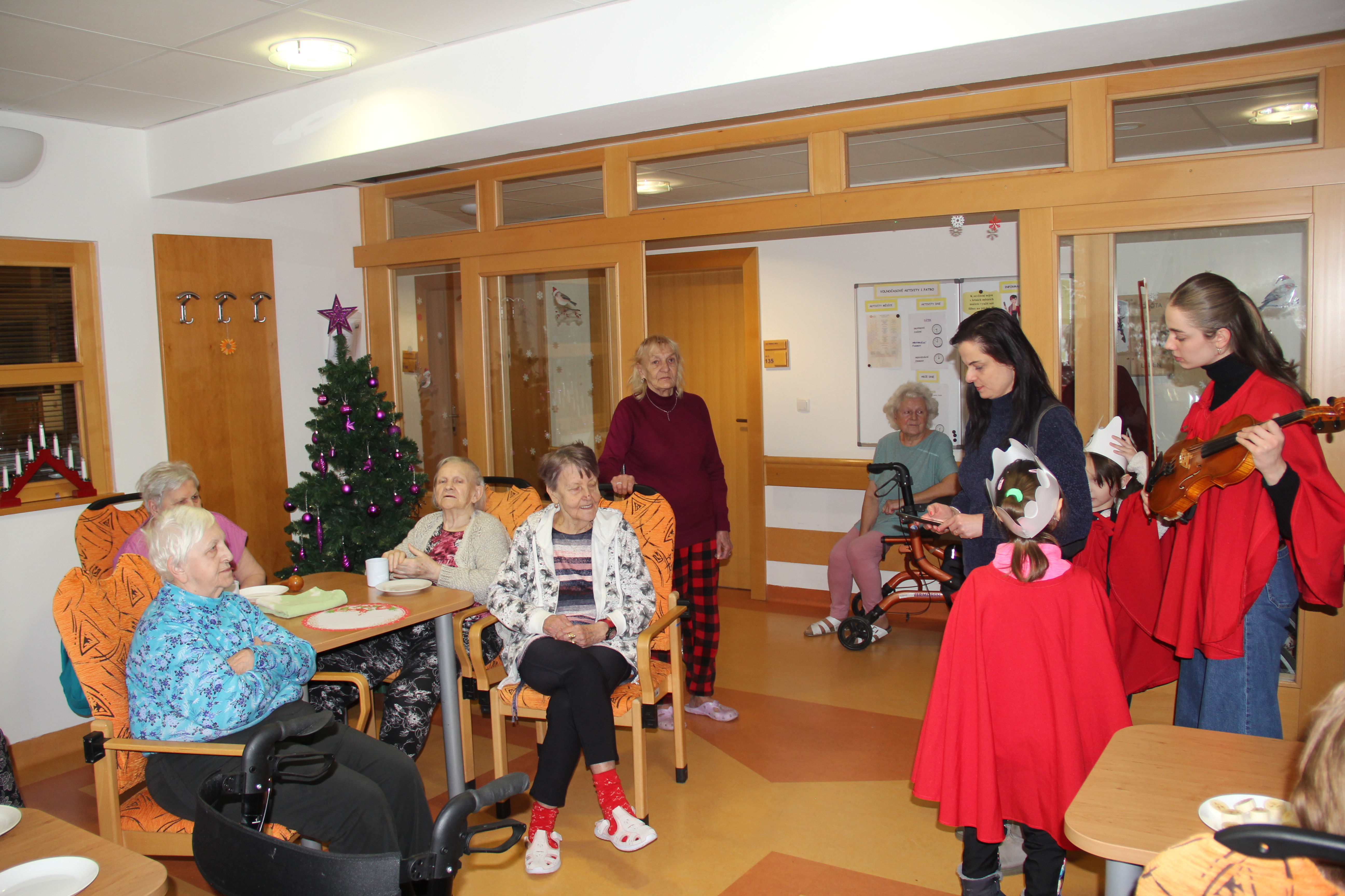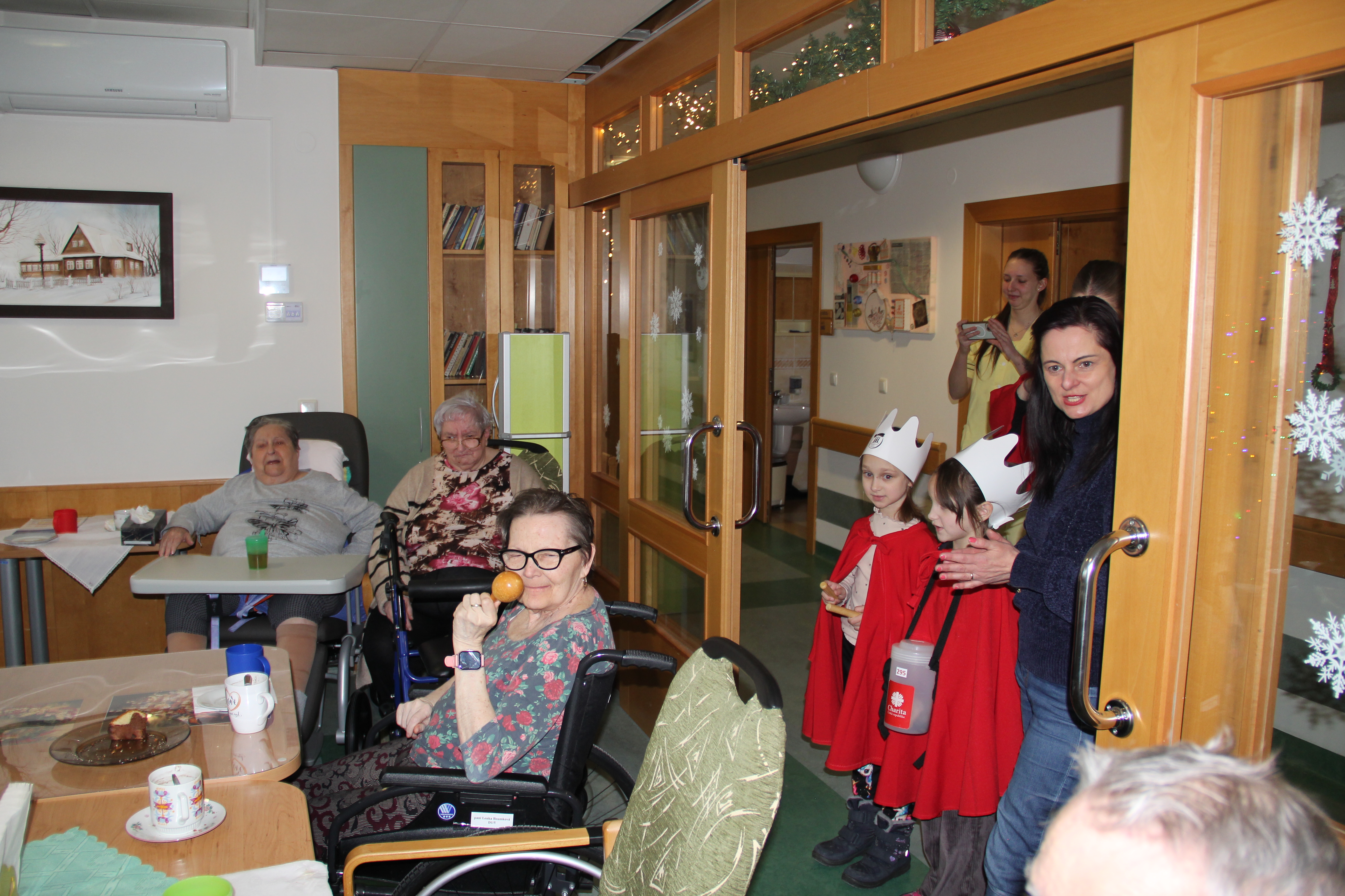 Ta se opravdu povedla. V sobotu 11.1. dorazily do našeho domova dvě skupinky koledníků zazpívat a popřát vše dobré do nového roku našim klientům. Za doprovodu houslí a zobcové flétny zazpívali nejen My tři králové jdeme k vám, ale rovněž přidali i sérii koled dle přání klientů na jednotlivých odděleních služeb DS a DZR. Bylo krásné vidět, jak se vynořují z dlouhodobé paměti slova jednotlivých koled a nebylo oddělení, kde by se klienti do zpěvu, a často i doprovodu na dřívka či rumba koule, nepřidali.